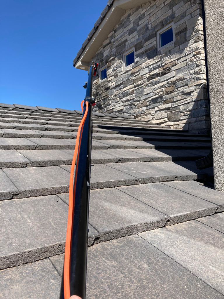 Our water fed pole can be extended to 36 ft. No need to walk on the roof and potentially crack tiles.